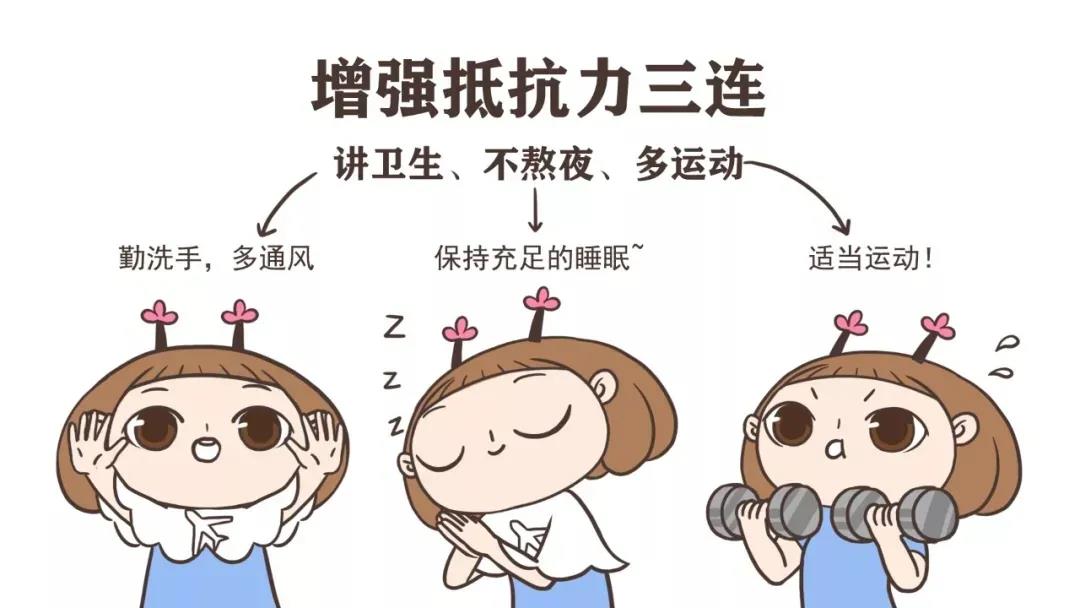 除了勤洗手以及注意好個人防護,大家一定要加強體育鍛煉提高個人免疫力。多吃一些富含維生素的食物,多喝水提高代謝。